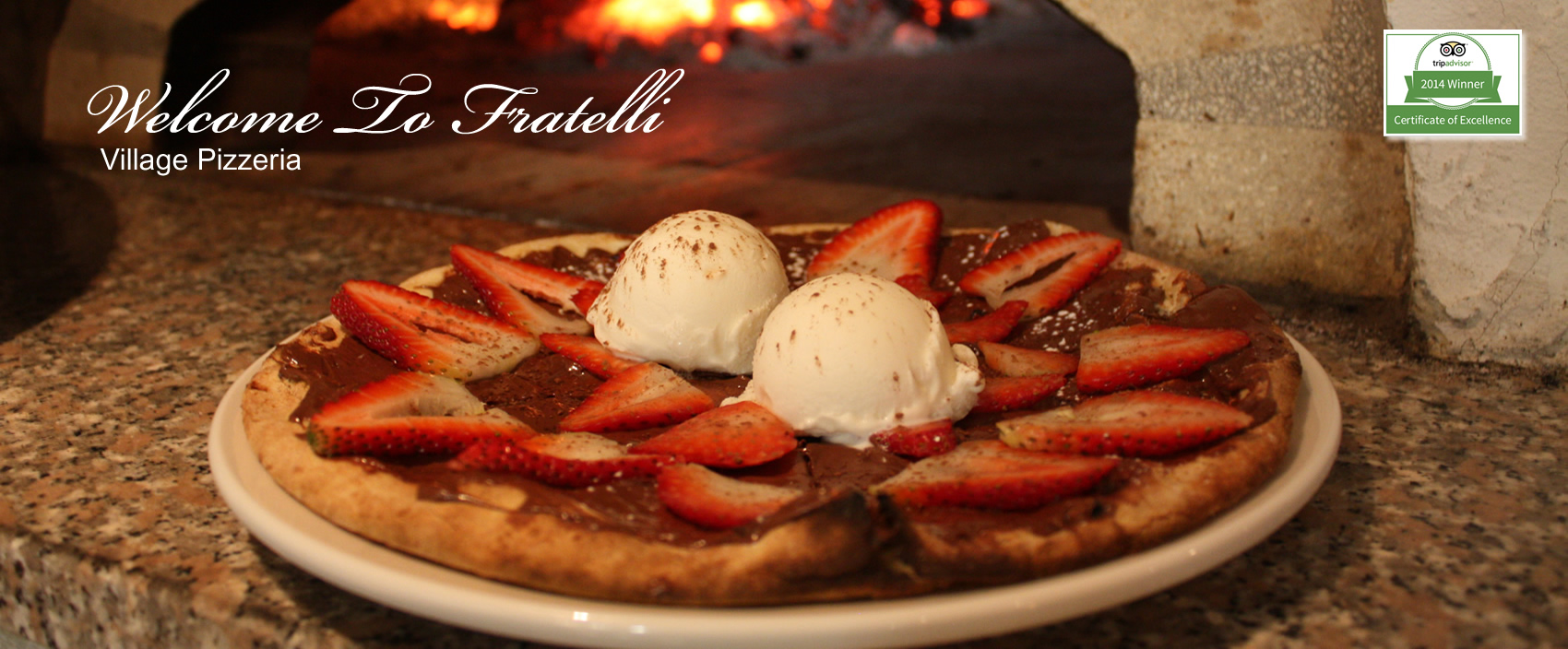The Fratelli menu reads like a delicious journal of personal recipe favorites. Any pizza you choose from the varied and carefully selected menu choices arrives warm and direct from the wood burning stone oven, and looks as good as it tastes. The choice of pasta or meat dishes, great appetizers or homemade desserts are all favorites selected and refined over the years from original recipes by the brothers and long time customers. Come get a taste of a village pizzeria named Fratelli.